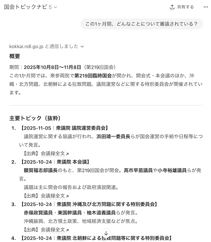 GPTsを使って便利機能を作成することができました。特に、国会会議録トピックナビは、GPTsならではのものに仕上がったと思います!