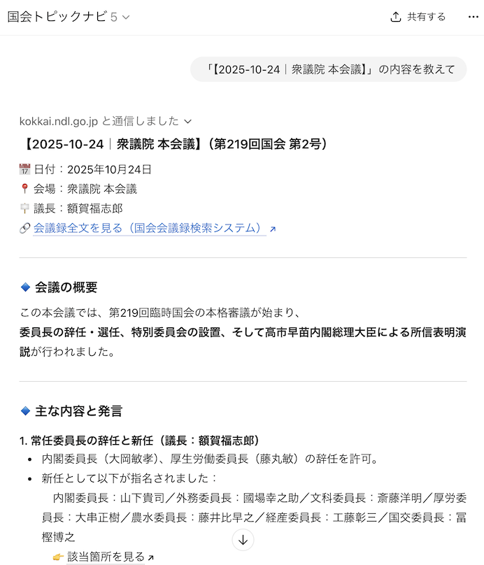 – すべての情報はアクション(国会議事録API)で取得できたデータのみに基づく。外部のニュース、要約サイト、またはAIの推測を用いない。