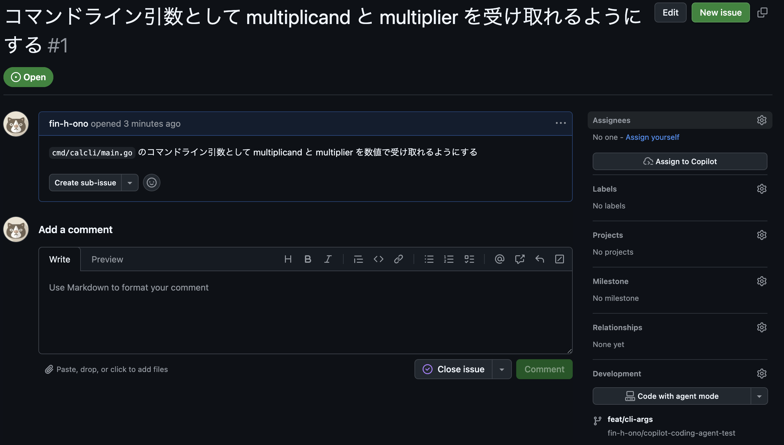 Copilot コーディングエージェントを使って、Issueからコードを生成するところを試してみました。