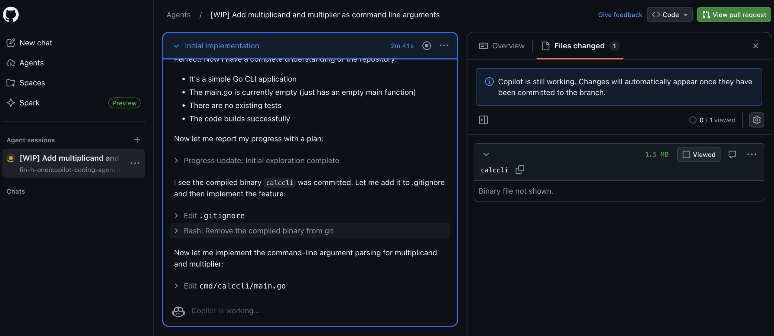 チャットからセッションを見てみると、Copilot コーディングエージェントがステップを踏んで動作しているのが見れます。