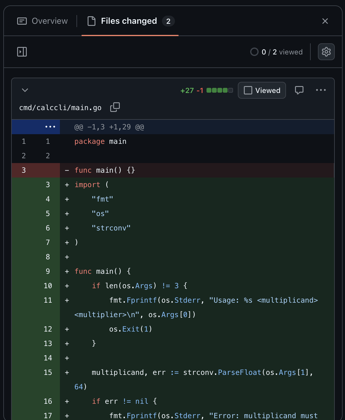 | 1 2 3 4 5 6 7 8 9 10 11 12 13 14 15 16 17 18 19 20 21 22 23 24 25 26 27 28 29 | package main import ( "fmt" "os" "strconv" ) func main() { if len(os.Args) != 3 { fmt.Fprintf(os.Stderr, "Usage: %s <multiplicand> <multiplier>\n", os.Args[0]) os.Exit(1) } multiplicand, err := strconv.ParseFloat(os.Args[1], 64) if err != nil { fmt.Fprintf(os.Stderr, "Error: multiplicand must be a number\n") os.Exit(1) } multiplier, err := strconv.ParseFloat(os.Args[2], 64) if err != nil { fmt.Fprintf(os.Stderr, "Error: multiplier must be a number\n") os.Exit(1) } result := multiplicand * multiplier fmt.Printf("%g * %g = %g\n", multiplicand, multiplier, result) } |