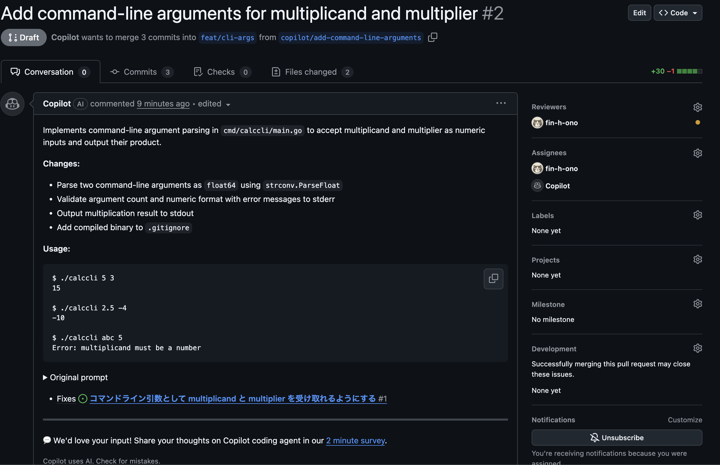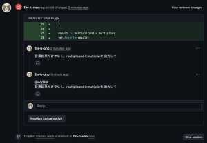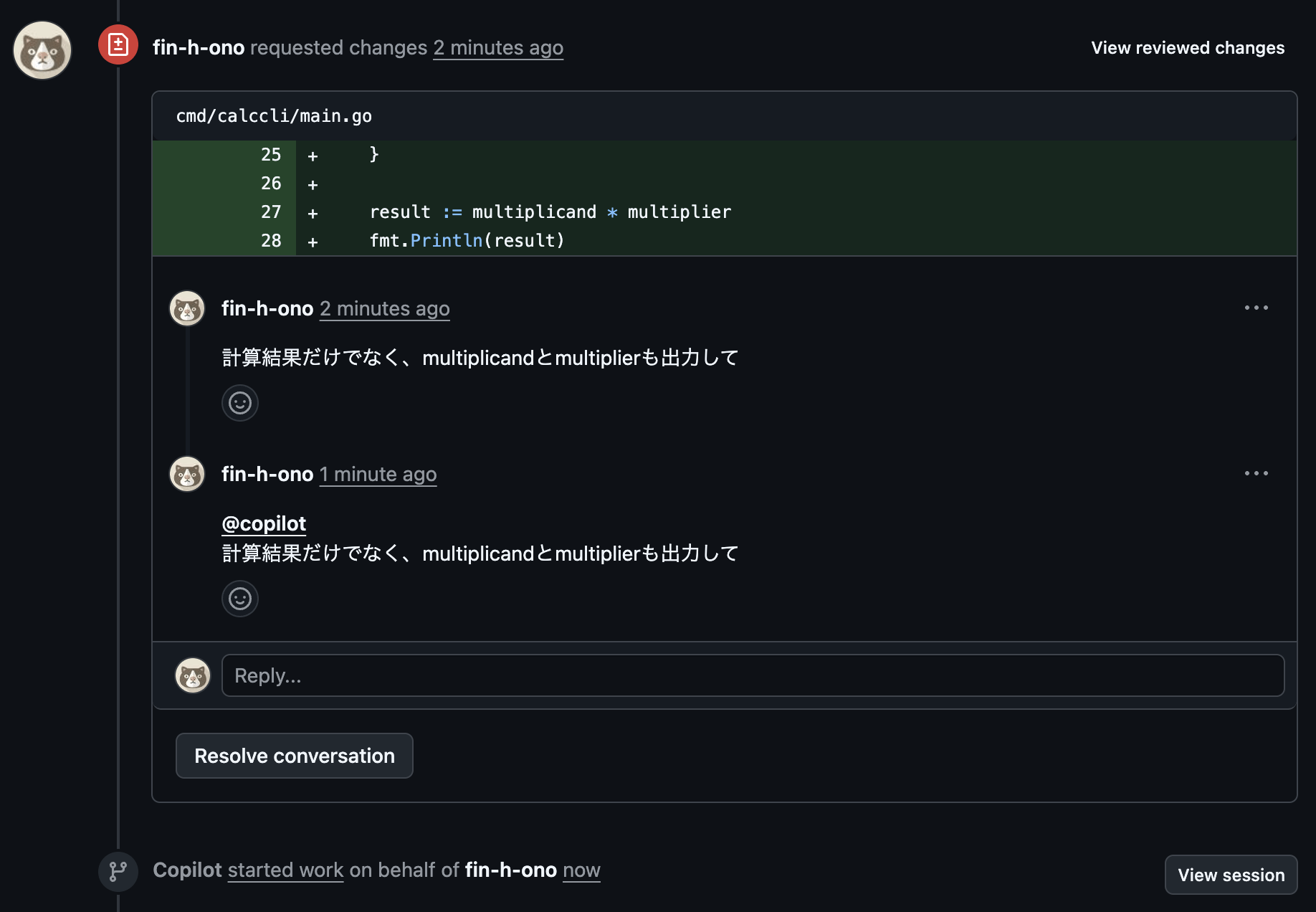 このPRに対して変更してほしい部分があれば、Copilotにメンションしてコメントを書きます(レビューコメントを書いただけでは修正が行われませんでした)