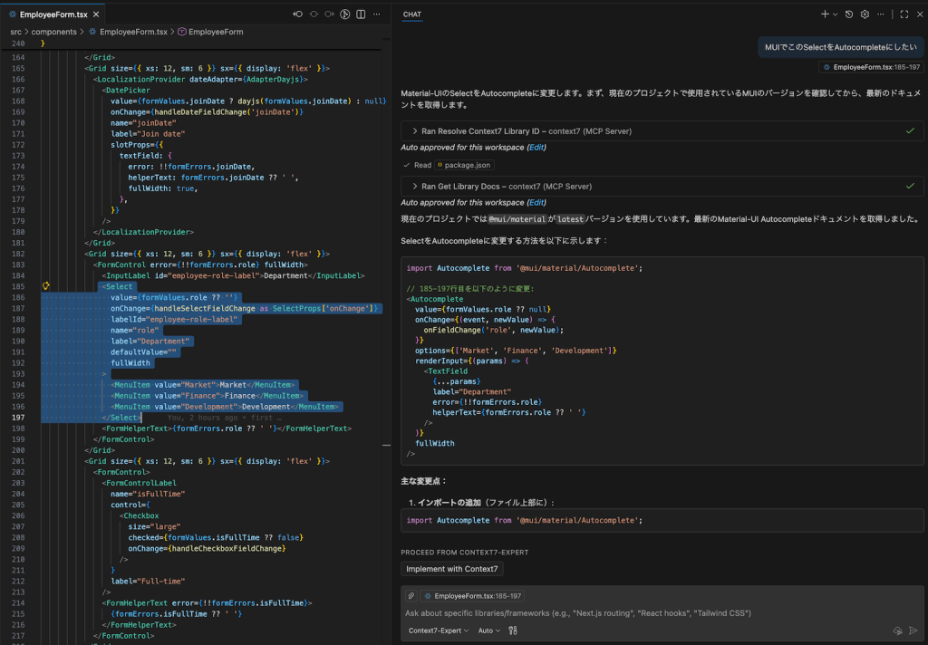 Context7を参照し、最新の情報に基づいて実装をするエージェントです。今回は、MUIのSelectをAutocompleteに置き換えるように依頼してみました。